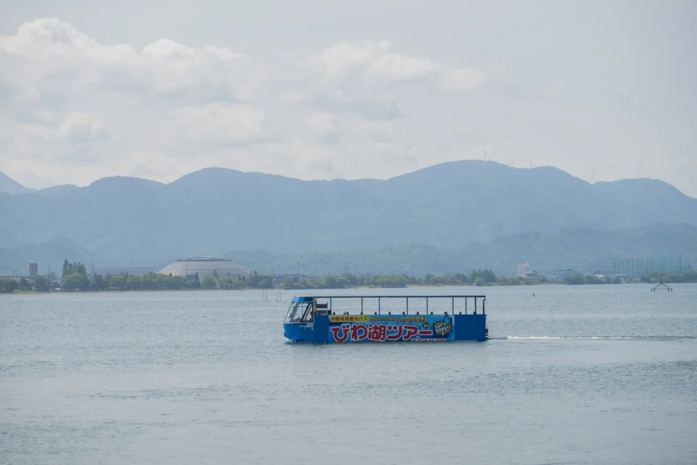 비와호를 바라보면서 자연의 바람을 맞고, 호안을 달리고 항구에 도착하면 수륙 양용차가 비와코에 다이브!